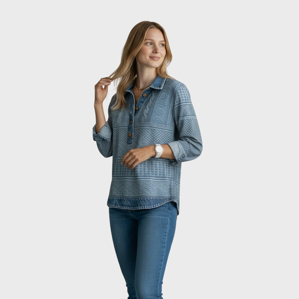 Model Elise je mistrovským dílem optické iluze a pohodlí. Na první pohled vypadá jako propracovaný outfit složený z vlněného svetru s copánkovým vzorem a džínové košile. Ve skutečnosti jde o jedinou, lehkou a měkkou tuniku, která vám zajistí dokonalý "vrstvený vzhled" bez zbytečného objemu a horka. Je to ideální řešení pro ženy, které milují styl, ale upřednostňují jednoduchost a komfort.